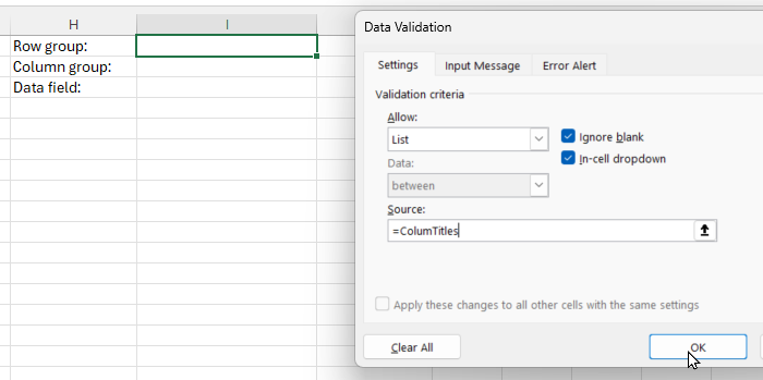 To create the dropdowns for these, first create a range called ColumnTitles as follows: