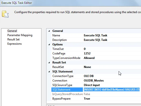 The result: SSIS will execute this SQL task for each file in the given folder.