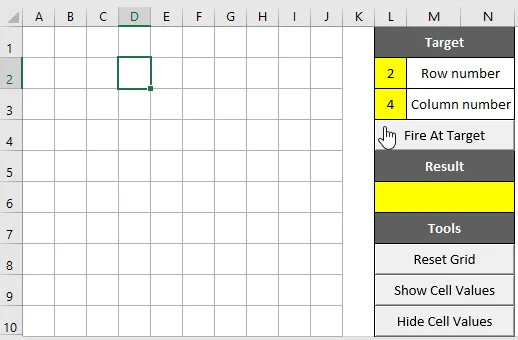 Clicking the Fire At Target button will select the cell in the specified row and column of the worksheet.