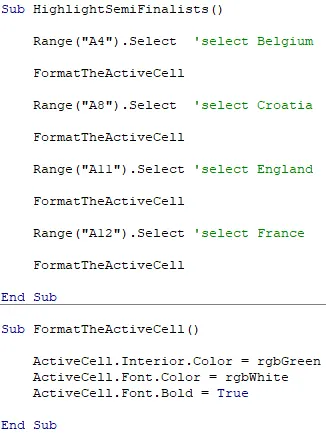 Open the VBE and find the subroutine called HighlightSemiFinalists in Module1.