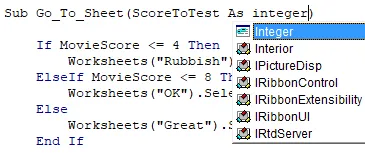 After the parameter name you can define what type of data it should be capable of storing by writing As followed by a data type. We want the ScoreToTest parameter to have the same data type as the original MovieScore variable so we'll use Integer: