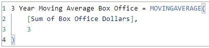MOVINGAVERAGE( Column, WindowSize, [IncludeCurrent], [Axis], [Blanks], [Reset] )