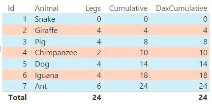 However, the FILTER function - having removed one constraint - then immediately applies another: namely, that it will only consider animals whose id is less than or equal to the maximum id for the rows for the current filter context (ie 5, in the case of our Dog). So the final filter context is actually this for the Dog row: