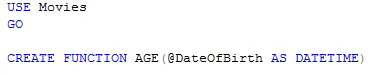 CREATE FUNCTION AGE(@DateOfBirth AS DATETIME)