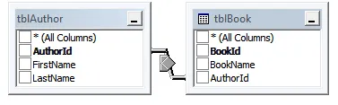 Drag the AuthorId column (1) onto column (2) in the tblBook table to create a join.