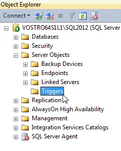 Expand the Server Objects folder within the server to find the Triggers folder.