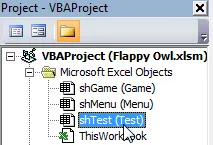 Now we'll add code for the button which stops the game. You don't need to go back to Excel to do this, we can get to the click event procedure from the VB Editor. Start by double-clicking the shTest sheet object in the Project Explorer window.