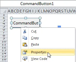 To change the properties of a control you'll need to view the Properties window. Right-click on the button that you added to the Test sheet and choose Properties.