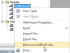 The next job is to convert the module containing all of the bird code into a class module. Start by inserting and renaming another class module: